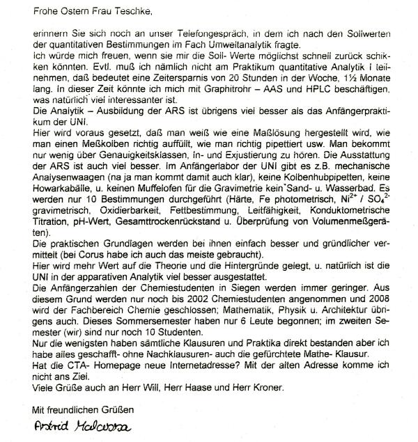 - Erfahrungsberichte von CTA-Absolventen: Sebastian Frink (Juli 2003), Astrid Malassa (April 2001)