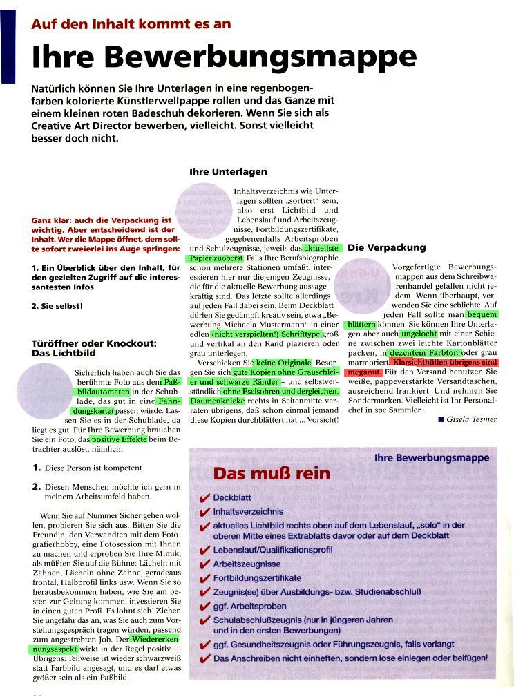 - Gestaltung einer Bewerbungsmappe, aus: effekt, jobs, markt, karriere, Nr. 11/99, S. 64
