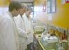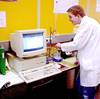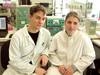 Sascha Röder und Kathrin Müller im Betriebspraktikum im Labor für Analytische Chemie (vor einem Ionenchromatographen) an der Fachhochschule Gießen, März 2002