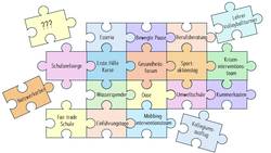 Das unten dargestellte Puzzle beschreibt einige unserer aktuellen Arbeitsinhalte. Es stellt einen IST-Zustand dar. Ziel der schulischen Gesundheitsförderung ist seine beständige Aktualisierung und Erweiterung, so dass neue Teile hinzu kommen und alte Teile ersetzt werden.