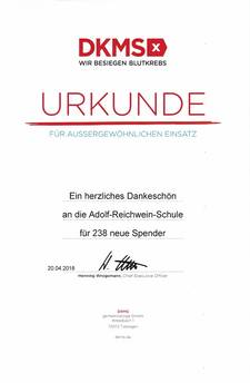 Alle 15 Minuten erhält in Deutschland ein Patient die Diagnose Blutkrebs. Vielen Patienten hilft nur eine Stammzelltransplantation. Jedoch findet jeder siebte Patient keinen passenden Spender. Aus diesem Anlass heraus wurde an der Adolf-Reichwein-Schule eine Typisierungsaktion durchgeführt, um potenzielle Spender für die Datenbank der DKMS (Deutsche Knochenmarksspende) zu gewinnen. 540 Schülerinnen und Schüler sowie deren Lehrkräfte informierten sich im Rahmen von drei Vorträgen über das Thema Blutkrebs, 238 ließen sich anschließend durch Mitschülerinnen und Mitschüler des Beruflichen Gymnasiums registrieren. Insgesamt ein sehr gutes Ergebnis für die DKMS.
