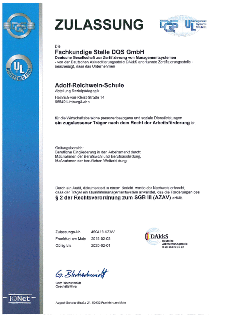 Mittlerweile ist die Rezertifizierung nach AZAV erfolgt und die Abteilung Sozialpädagogik der Adolf-Reichwein-Schule hat den Nachweis erbracht, dass sie ein Qualitätsmanagementsystem anwendet, das den Forderungen des §2 der Rechtsverordnung zum SGB III (AZAV) erfüllt. Sie ist damit ein zugelassener Träger nach dem Recht der Arbeitsförderung.