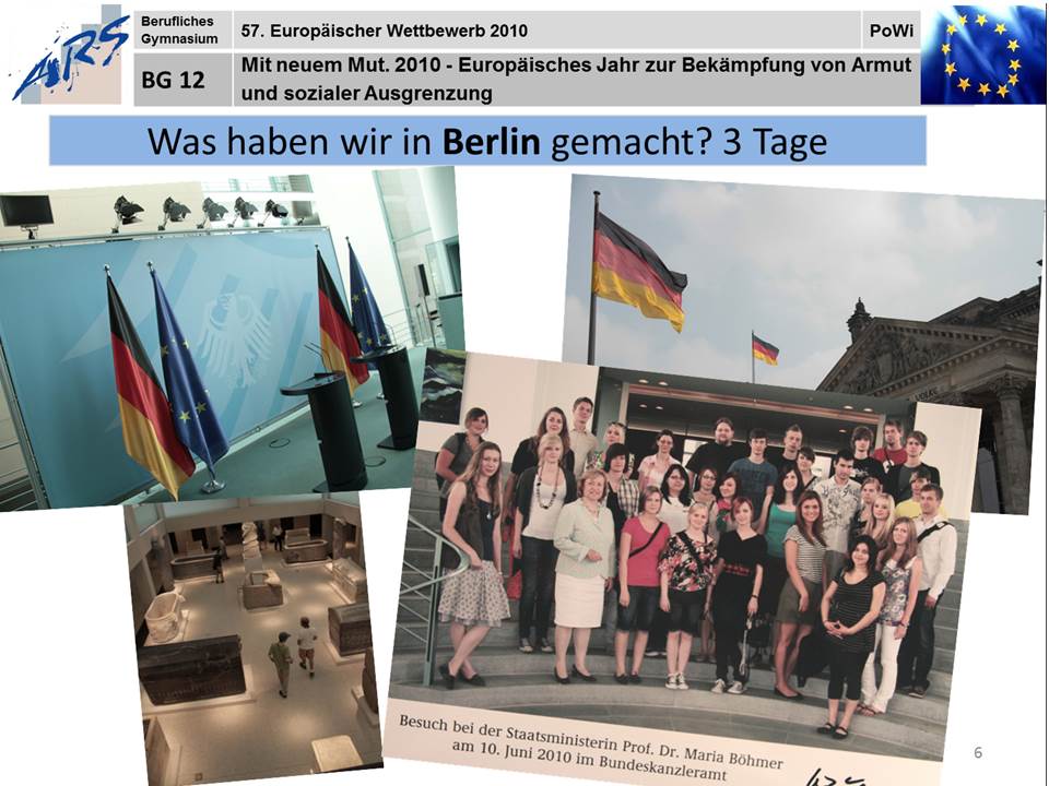 Katharina Scheid, Jan Hennemann, Sarah-Ann Starks, Lea Jarnicki und Tanja Salagaeva konnten bereits ihr Ticket nach Berlin über 3 Tage einlösen. Im Kanzleramt hatten sie die Möglichkeit ihre Arbeiten vorzustellen und zu erläutern. Besuche z. B. im Neuen Museum standen auf dem Programm. Übernachtungen in einem 4 Sterne Hotel versüßten den kulturellen Aufenthalt.