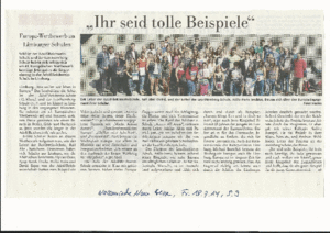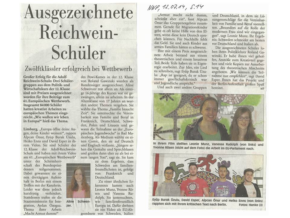Sie nahmen am 61. Europäischen Wettbewerb teil und konnten mehrere Preise gewinnen wie einen Besuch in Berlin, Geld- und Buchpreise. Jetzt wurden die Sieger in der Adolf-Reichwein-Schule geehrt. 84 000 Schüler hatten an diesem Wettbewerb teilgenommen, wie der Leiter der Reichwein-Schule, Ralf Abel, berichtete. Gewonnen haben viele Schüler aus Limburg, wie die NNP schon berichtete. Alpcan Önur, Eyüp Burak Üzulu, Heiko Enns und David Esper von der Adolf-Reichwein-Schule hatten zum Beispiel ein Video gedreht und gerappt: „Europa öffne deine Augen, deine Kinder weinen!“ Es gab bundesweit vorgegebene Themen wie „Macht Armut dumm?“, „Familienfreundliches Europa“, „Chillen oder Schuften?“, und „Europawahl“. Abel betonte die Wichtigkeit Europas vor allem in Hinblick auf seine Sicherheits- und Integrationsfunktion. „Ich erinere an den Ausbruch des Ersten Weltkrieg vor 100 Jahren“, sagte Abel.