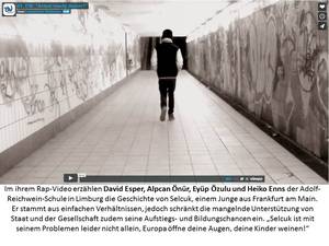 Bundessieger: David Esper, Alpcan Önür, Eyüp Özulu und Heiko Enns (BG 12): Rap und Hausarbeit machten einen wohlverdienten viertägigen Besuch in Berlin mit dem EP-Präsidenten Martin Schulz klar! Melodie, Text, Video und Technik aus eigener Hand und in Limburg gedreht! In ihrem Rap-Video erzählen David Esper, Alpcan Önür, Eyüp Özulu und Heiko Enns der Adolf-Reichwein-Schule in Limburg die Geschichte von Selcuk, einem Junge aus Frankfurt am Main. Er stammt aus einfachen Verhältnissen, jedoch schränkt die mangelnde Unterstützung von Staat und der Gesellschaft zudem seine Aufstiegs- und Bildungschancen ein. „Selcuk ist mit seinem Problemen leider nicht allein, Europa öffne deine Augen, deine Kinder weinen!“ Ihr kritischer, authentischer Text stimmt nachdenklich und rüttelt auf! Arbeitslosigkeit der Eltern und geringer Verdienst wirken sich nicht nur auf die tägliche Versorgung der Kinder aus, sondern auch auf deren Chancen auf Bildung und Ausbildung. Analysieren Sie den Zusammenhang von Armut und Bildungserfolg in Europa