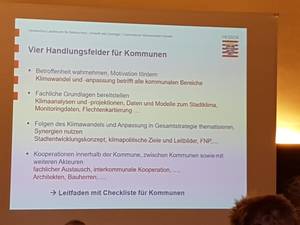 So sollten die Kommunen vier Handlungsfelder abarbeiten, um entgegenzusteuern. Das erste Handlungsfeld ist, dass die Betroffenheit der Bevölkerung wahrgenommen werden muss. Denn der Klimawandel und die Klimaanpassung durch die Kommune betrifft alle kommunalen Bereiche. Das zweite Feld ist, dass eine fachliche Grundlage zur Verfügung gestellt werden muss, darunter fallen Klimaanalysen und Klimaprojektionen, Daten und Modelle zum Stadtklima, Monitoring Daten und Flechtenkartierung. Das dritte Feld thematisiert den Klimawandel und die Anpassung in einer Gesamtstrategie, dies beschreibt unteranderem das Stadtentwicklungskonzept und die klimapolitischen Ziele und Leitbilder. Das vierte Handlungsfeld ist die Kooperationen innerhalb der kommunalen Stadtteile, zwischen den Kommunen sowie mit weiteren Akteuren. Dabei ist es wichtig, dass ein fachlicher Austausch stattfindet und Architekten sowie Bauherren involviert werden.