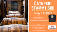 Der nächste Caterer-Stammtisch findet am Freitag, 3. April statt. Zuerst besichtigen wir die Moonshine Distillery, Limburgs erste Whisky-Destille, danach treffen wir und thematisch passend in der Villa Konthor, Best Whisky Bar 2009, um den Abend ausklingen zu lassen. Wir freuen uns auf unsere Studis, Absolventen, Kooperationspartner, Freunde und alle Interessierten!