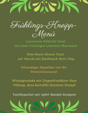 Um den #modernkneipp zu unterstützen wurden unsere Studierenden als Experten für den Bereich der Ernährung eingespannt. Es galt ein Menü zu entwickeln. Dieses soll den Ansprüchen von Kneipp genügen, ansprechend sein und vorallem, leicht nach zu kochen sein.
