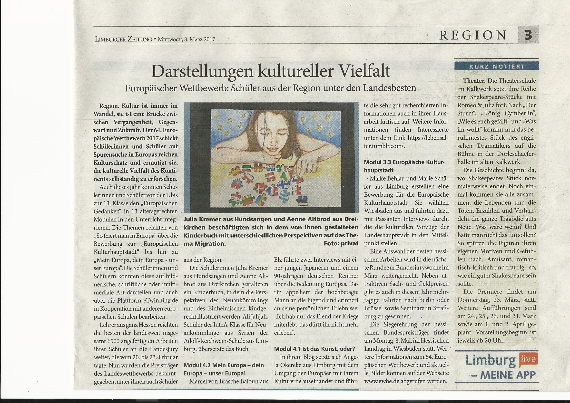 „Europa war ein Traum weniger. Sie wurde eine Hoffnung für viele.“ Die Aktualität dieses Zitats Adenauers postuliert eine Schülerin der Adolf-Reichwein-Schule in Limburg in ihrer Rede zu 64. Europäischen Wettbewerb.LehrerInnen aus ganz Hessen, besonders aber aus den Kreisen Fulda, Limburg, Kassel, Offenbach, Marburg, Wiesbaden und dem Hochtaunuskreis reichten die besten von 6500 in Hessen angefertigten Arbeiten ihrer SchülerInnen an die Landesjury weiter, die vom 20. bis 23. Februar 2017 an der Ricarda Huch Schule in Dreieich-Sprendlingen tagt.