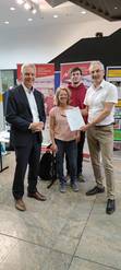 Die beiden Staatssekretäre Dr. Manuel Lösel (Kultus) und Herr Oliver Conz (Umwelt) konnten sich bei der Verleihung des Zertifikates an der Goethe-Universität in Frankfurt von der hohen Qualität der an der Adolf-Reichwein-Schule durchgeführten Projekte überzeugen. Sie überreichten den anwesenden Vertretern Frau Molsberger-Lange, Herrn Narewski und dem CTA-Schüler Kiva Azarlei zwei Zertifikat-Tafeln sowie die Urkunde „Umweltschule – Lernen und Handeln für eure Zukunft“.